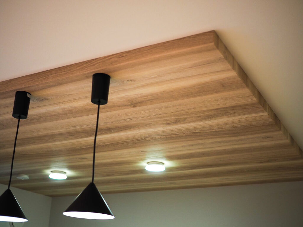 キッチンの木目調の下がり天井は、空間と馴染みながらも独立したように見えるポイント。