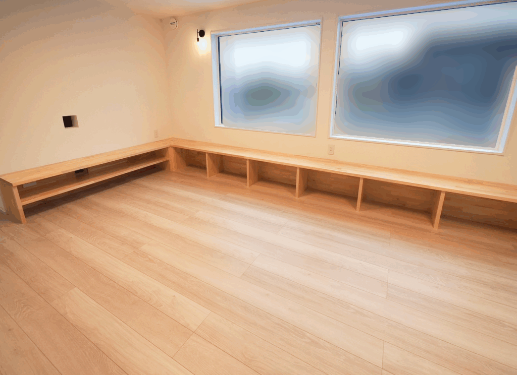造作のベンチとテレビボード。こどもの机替わりにもなりそうな造りは、シンプルだけど機能性もしっかり。