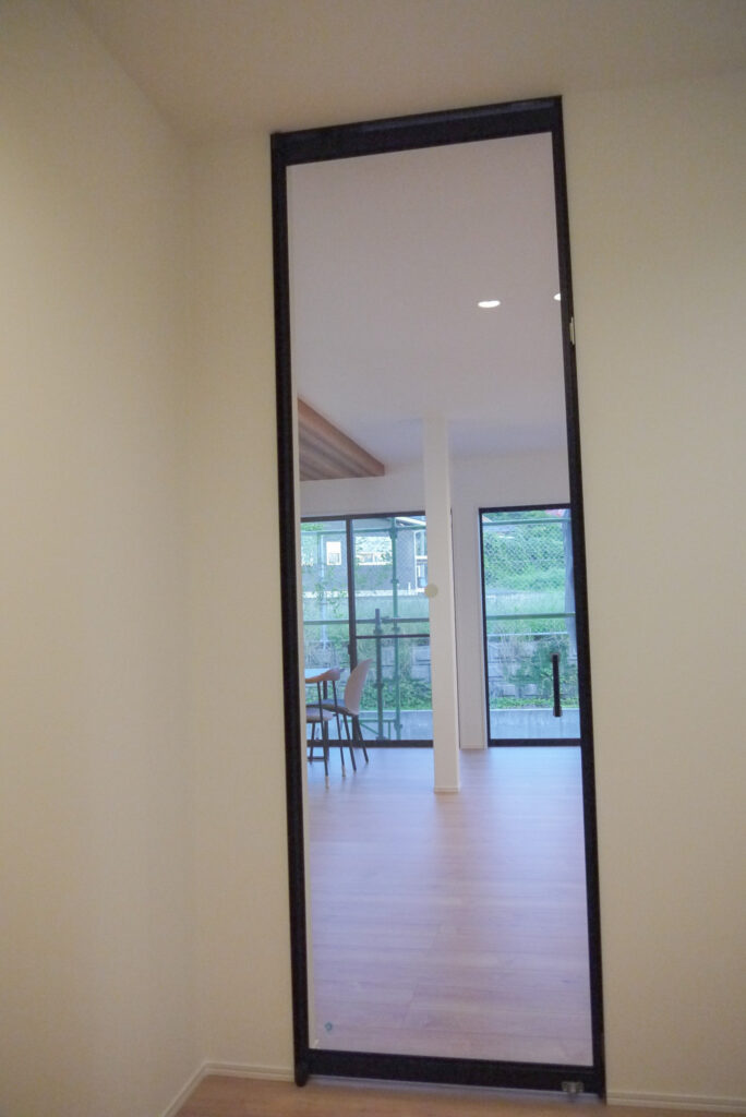 玄関ドアを開けるとガラスドアの向こうには、洗練された空間が見え奥行を感じます。