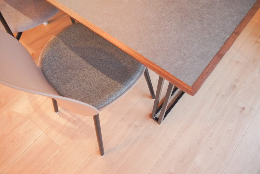 空間に馴染む照明とグレー×木目調のインテリアは、ARKHOMEの打ち合わせスペースにある物を